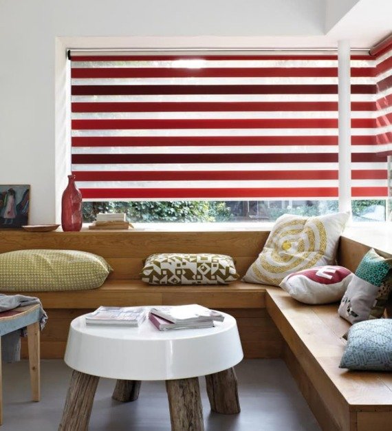 Полотно ткани, состоит из чередующихся горизонтальных полос – прозрачных и непрозрачных. Изменяя положение этих полос относительно друг другу, можно создать целых 3 режима регулировки светом. Например, чтобы в помещении стало светлее, нужно расположить прозрачные полосы друг напротив друга. Если разместить прозрачную и непрозрачную полосу параллельно друг другу, то можно добиться практически полного затемнения.